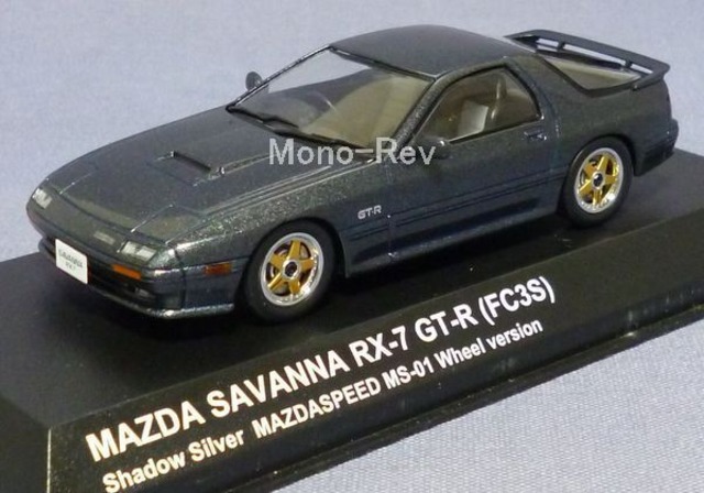 京商K03302SS 1/43 マツダ サバンナ RX-7 GT-R(FC3S) マツダ スピード MS-01 ホイールバージョンです。カラー:灰メタ(シャドウシルバーをイメージ)、2015年9月発売品、中国製です。紙パッケージ(擦れあり)、クリアケース付(擦れあります)。世界中にファンのいるロータリー・スポーツです。