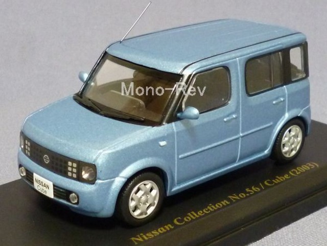 1/43 日産 キューブ (Z11) 2003 日産名車コレクション、フランスのメーカー・ノレブの製品で中国製です。車体色:淡メタ青(おそらく2006年のマローブルーを参考にしたものと思われます)、スケール1/43(車体全長約85mm)、クリアケース付き。2010年11月10日にアシェットコレクションジャパン社から発売の書籍「日産名車コレクション 1/43 VOL.56」に付属のクルマです。元の金型はJコレクションのものです。 マーチをベースに独特なデザインのボディを纏っています。見た感じで「速さ」を表現していないところがポイントです。