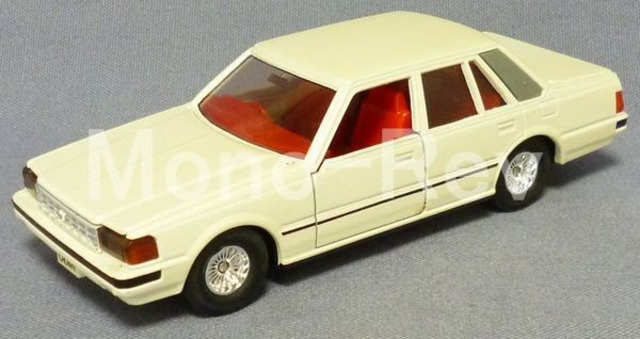 トミカダンディDJ-005 トヨタ クラウン 4ドアセダン (MS123)、日本製です。カラー:パール白、スケール:1/43(約121mm)、シートカラー:赤、箱付です。フロントフードの塗装にプツプツがあります。 1983年のモデルチェンジの7代目クラウンで、トミカになったのはセダン最上級グレードの2800ロイヤルサルーンGです。トミカはコロッとした感じですが、こちらは実車の感じに近いです。
