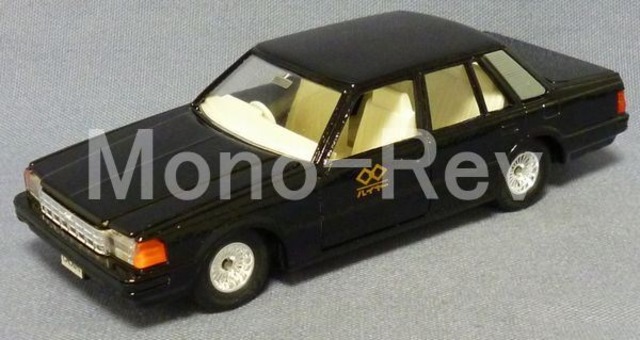 トミカダンディDJ-005 トヨタ クラウン 4ドアセダン (MS123)、日本製です。カラー:黒(ハイヤー仕様)、スケール:1/43(約121mm)、シートカラー:アイボリ白、箱付です。屋根右後ろ角におそらく発泡スチロールとの兼ね合いだと思いますが、つやの無い部分があります。同一品番の色替え車です。 1983年のモデルチェンジの7代目クラウンで、トミカになったのはセダン最上級グレードの2800ロイヤルサルーンGです。トミカはコロッとした感じですが、こちらは実車の感じに近いです。