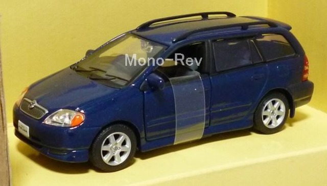 エムテックT-02-C トヨタ カローラ フィールダー 2001年発売品、中国製です。スケール1/43(車体長さ約96mm)。前ドアが開閉できます。車体カラー:ブルー(ダークブルーマイカメタリックをイメージしたもので、いわゆる紺メタです)。少傷みのあるパッケージ付き。 9代目カローラは2000年8月発売。ミニカーはワゴンモデルのフィールダーです。