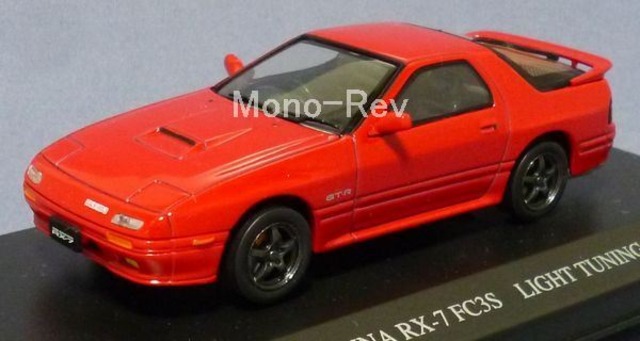 アオシマ DISM7531 マツダ RX-7 FC3S ライトチューニングです。2006年12月下旬発売品、カラー:赤、中国製です。前窓上部の窓内側黒縁取りにムラがあります。フロントフードやドアの塗装に細かな凸凹があります。クリアケース、パッケージ付きです。(裏の品名シール部は剝がれて無くなっています)。 1989年3月マイナーチェンジ車でGT-Rグレードの街乗り仕様と言ったところでしょうか。エムテックの金型を利用した製品と思われます。