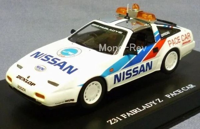 SKYNET DISM 1/43 日産 フェアレディZ 300ZR (HZ31) FISCOペースカー、2008年発売品です。車高調整可能、その他のギミックはありません。フロントとリヤのアンバー(オレンジ)が塗装面に色移りしています(リヤランプ部はほとんどわかりません)。紙パッケージ、クリアケース付き、製品番号DISM7787。 ベースはZ31の86年マイナーチェンジ車です。1987年の「WEC in Japan」や「F3000」などの先導車としてコースを走りました。