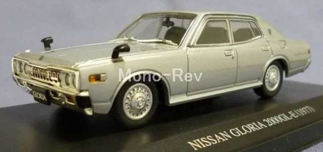 SKYNET DISM 1/43 日産 グロリア 2000GL-E (331) 後期 シルバーメタリック、2006年発売品です。車高調整可能、その他のギミックはありません。紙パッケージ、クリアケース付き、製品番号DISM7419。 GL-Eは1975年10月に追加された電子制御燃料噴射装置付きのL20エンジンを搭載したクルマで、さらに1976年6月に51年排ガス適合(型式331に更新)を経て1977年6月グリル等の意匠変更を受けました。ミニカーはこの1977年6月マイナーチェンジ車をモデル化しています。