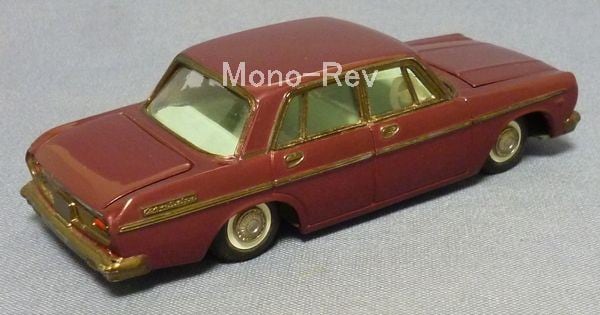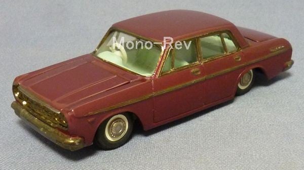 ダイヤペット143 トヨペット クラウン デラックス 1965年です。ボディ色:マルーンメタ、スケール1/40くらい(全長約116mm)、フロントフードとトランク部開閉可能、グリルやモール、窓枠などの地金部にくすみあり、生産から約60年経過しておりますがタイヤの割れも無く、大変良いコンディションです。箱はありません。モノ レブYouTube動画 #110回でご紹介のミニカーです。