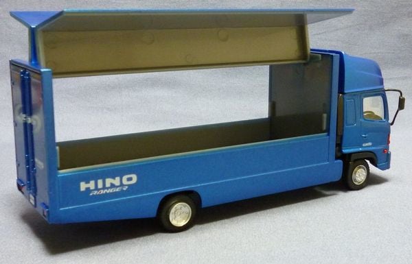 エムテック 日野レンジャー AIR LOOP 2012年中国製です。スケール1/43(車体長さ約197mm)。ボディと荷台のカラーは青メタ、荷台左右ウィング開閉します。パッケージに凹みや傷みがございます。5代目レンジャープロの2010年、クリーンディーゼルシステム AIR LOOPを採用した、平成21年(ポスト新長期)排出ガス規制に適合車です。ミニカーは撮影用特別仕様車をイメージしています。