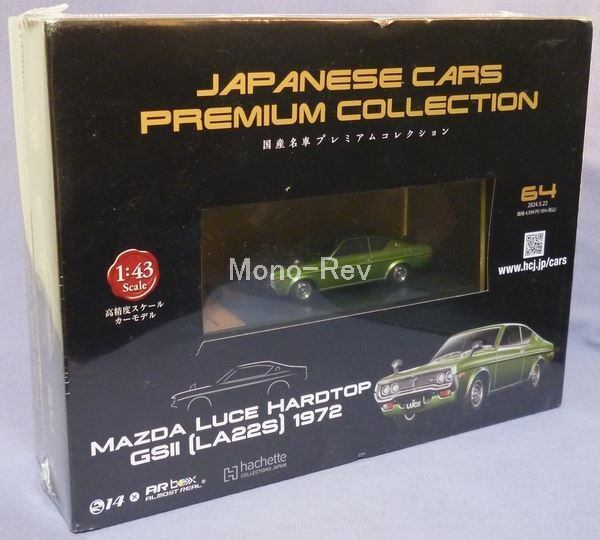 アシェット 国産名車 プレミアムコレクション 64号 1/43 マツダ ルーチェ ハードトップ GSII(LA22S)1972です。2代目ルーチェ ハードトップの1/43サイズミニカーでボディカラーは黄緑メタです。シュリンクパックもついたままの未開封品です。※発送サイズは80サイズです。