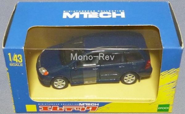 エムテックT-02-C トヨタ カローラ フィールダー 2001年発売品、中国製です。スケール1/43(車体長さ約96mm)。前ドアが開閉できます。車体カラー:ブルー(ダークブルーマイカメタリックをイメージしたもので、いわゆる紺メタです)。少傷みのあるパッケージ付き。