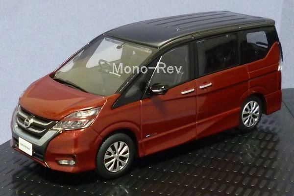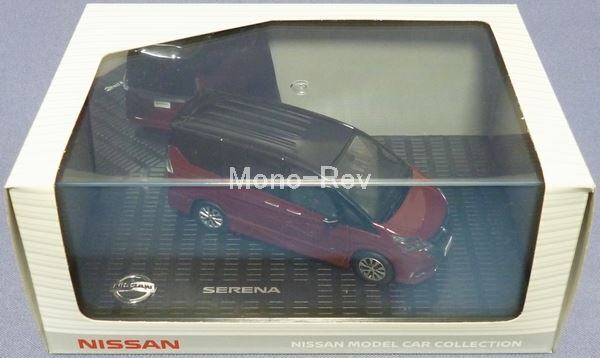 京商1/43 日産 セレナ ハイウェイスター C27 2016年製造品、中国製です。スケール1/43(車体長さ約110mm)、ボディカラー:マルーンレッド(RPM) /ダイヤモンドブラック(P) 2トーンです。開閉アクションなし、キレイなクルマです。少傷みのある紙パッケージつき、クリアケースに白っぽく色褪せがございます。2016年8月にフルモデルチェンジされたセレナです。
