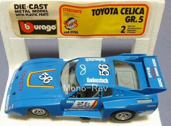 ブラーゴ1/24 トヨタ セリカ Gr.5 青です。車体長さ約175mm、左ハンドル仕様(タイヤの向きを変えるとハンドルも連動して動きます)、ドア開閉します。若干の汚れあり、ブラーゴ特有の小傷や擦れが若干擦れあります。パッケージは別のもので傷みや汚れがあります。1970年代終わりころの製品、イタリア製のブラーゴでは日本車を数点モデル化しています。品番はcod.0150です。※ 発送は80サイズになります。