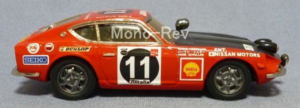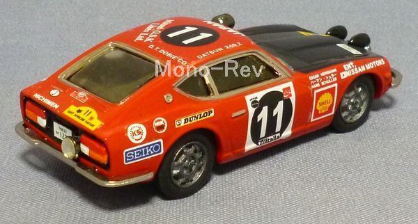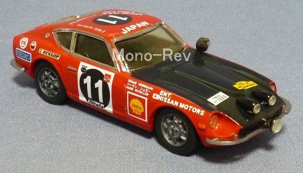 ファインモデル1/43 ダットサン 240Z 1971年サファリラリー優勝車です。ボディカラーは赤/黒ボンネットの11号車、全長約99mm(バンパーセンターランプを含む)、箱はありません。窓パーツはやや黄ばんだ感じになっています。アンチモニー合金製のミニカーで、ずしりとした重量があります。4輪がきちっと接地しておらず、タイヤとホイールアーチが干渉しているため、走らせるのには適していません。