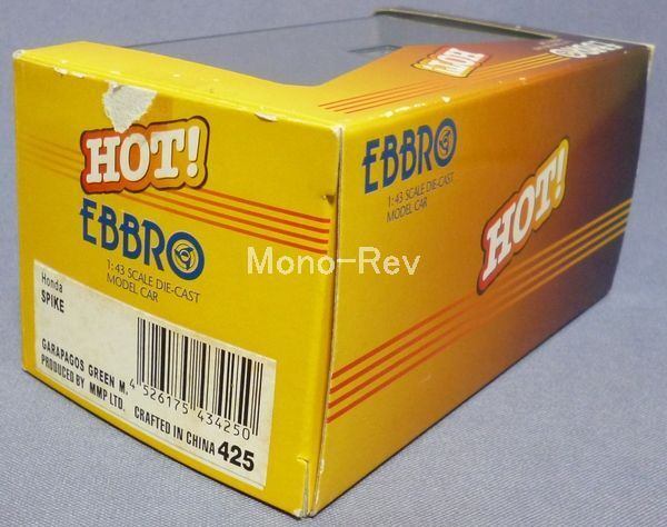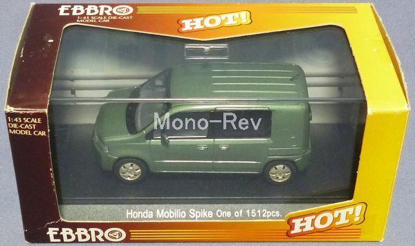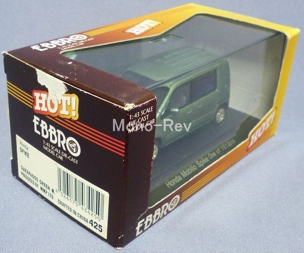 エブロ43425 ホンダ モビリオ スパイク (GK1/GK2) です。スケール1/43(全長約95㎜)、ボディカラー:淡緑青メタ(ガラパゴスグリーンメタをイメージ)、2003年発売品です。ホイールのシルバーが若干くすんでおり、金色風になっています。クリアケース付き、傷みのある紙パッケージ付き。キレイなクルマです。