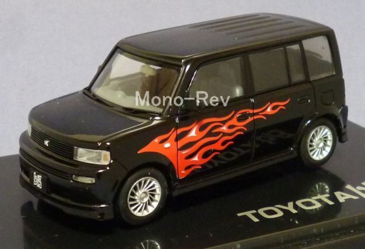 2001年発売品、エムテックホビーシリーズH-01-A トヨタbB (NCP31)です。1/43スケール、カラー:ブラック(側面にフレアーパターン)、中国製です。傷んだパッケージ付きです。