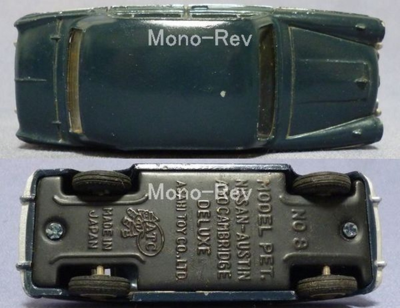モデルペットNo.8 モデルペット8 日産 オースチン A50 ケンブリッジ デラックス 紺 B131 (1959年型)、旭玩具1960年10月発売品です。全長約98㎜、ボディカラー:紺、シート無し仕様です。細かな傷やハゲ、汚れ、ホイールメッキ部サビがあります。製造より既に65年ほどが経過していますが、充分鑑賞に堪えうる状態です。箱はありませんのでクルマ単体でのお渡しとなります。画像をよくご覧ください。