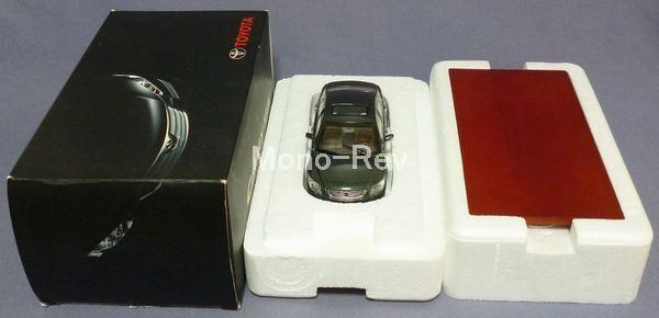 1/43 広汽トヨタ カムリ ACV40です。スケール1/43(全長約113㎜)、ボディカラー:緑灰メタ、灰色っぽいベージュ、左ハンドル、サイドモールのメッキにムラあり、開閉アクションはありません。スチロール梱包材、専用木製台座付き、紙パッケージにテープ貼りや傷みがあります。ディーラー配布品と思われます。日本仕様のカムリとはグリルなど細部が異なります。