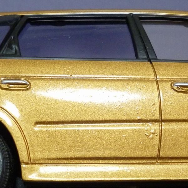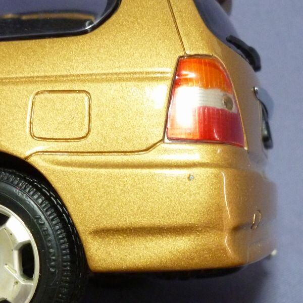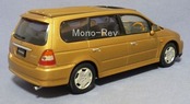 特注エブロ1/24 ホンダ オデッセイ(RA6)です。2000年販売品、製品番号:LM91GL、ボディカラー:ゴールド(ブレイズゴールドメタリックをイメージ)、右側面の塗装にプツプツあり、リヤバンパー左角に傷あります。紙パッケージ(やや傷みや汚れあり)、全長約195㎜のボディはダイキャスト製でかなりの重量感があります。取り外し可能なルーフ部品は樹脂製で歪みがあるためきっちりと収まりません。6人乗りキャプテンシートタイプの内装を見ることができます。黒ベース板つき及びベース貼り付け用ODYSSEYロゴシール付(未使用)です。ホンダダイレクトマーケティング(HDC)特注品で2代目オデッセイがデビューした際の成約記念品として配布されたクルマです。一部ミニカーショップ向けにも販売されました。※発送は80サイズです。