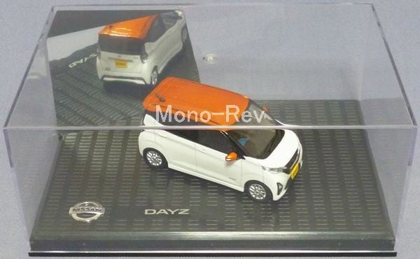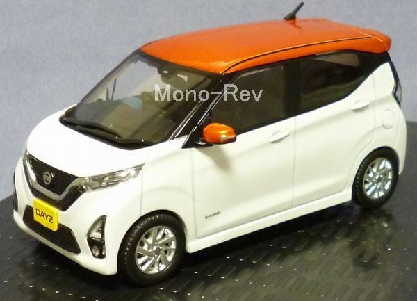 京商1/43 日産 DAYS ハイウェイスター (AA1) 日産パッケージ、2019年製造品、おそらく中国製です。スケール1/43(車体長さ約79mm)、ボディカラー:白パール/オレンジメタ屋根(ホワイトパール(3P)/プレミアムサンシャインオレンジ(M)2トーン【#XDT】特別塗装色)です。開閉アクションなし、キレイなクルマです。紙パッケージなし、少し擦れのあるクリアケース付きです。
