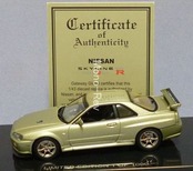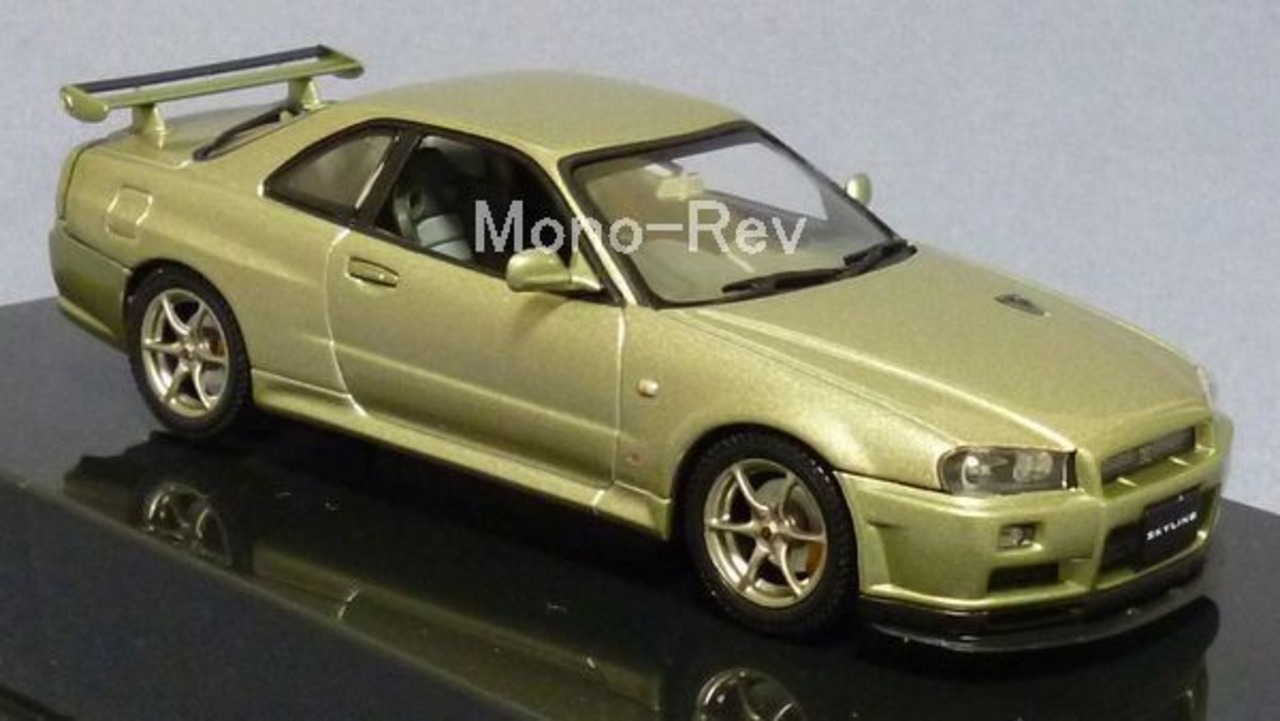 オートアート57338 1/43 日産 スカイライン R34 GT-R V-specⅡ ニュルです。2002年発売品、カラー:ミレニアムジェイド、中国製。紙パッケージ(破れや傷みあり)、クリアケース付(擦れあり)。