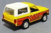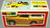 ダイヤペットT-1 日産 サファリ、1983年の製造品です。スケール:1/40(全長約105㎜)、ボディカラー:黄/白トップ、白トップのルーフ部に塗装ゴミ付着あり、左ドアキーホール凸部に擦れあり、側面グラフィックラベルに色褪せ(左側)や擦れ(右側)があります。フロントフード、左右ドア、バックドア開閉ギミックあり、箱付です。