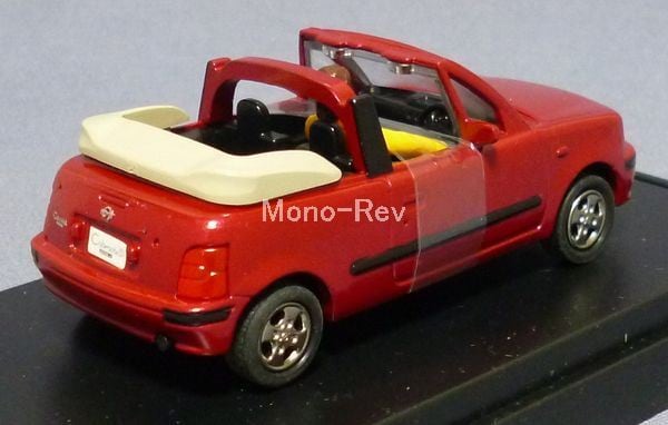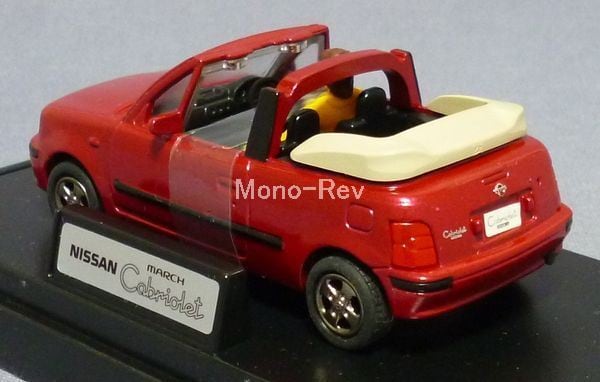 エムテックMC-02B 日産 マーチ カブリオレ (FHK11)、日本製です。スケール1/43(車体長さ約85mm)。開閉アクションはありません。車体カラー:赤メタ(ワインレッドパールメタをイメージ)。人形付属、外パッケージ(擦れ有り)、クリアケース(擦れあり)付き。
