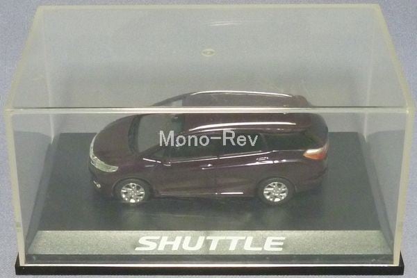 HC(ホンダコムテック)特注1/43 ホンダ シャトル ハイブリッド (GP7/GP8) ミスティックガーネットパール(ハイブリッドX、ハイブリッドZのオプション設定色)、 2015年製造品です。スケール1/43(全長約102mm)、ドアミラー付近に接着剤付着あり、紙パッケージなし、クリアケース付(擦れや退色あり)。一般販売のほか新車販売時に配布されました。中国製。2015年5月にフィット シャトルの後継車種として登場のシャトルです。