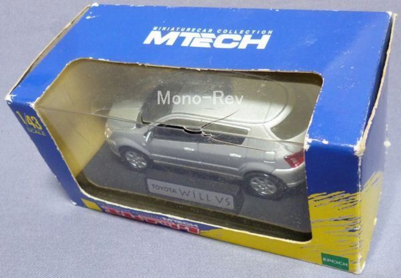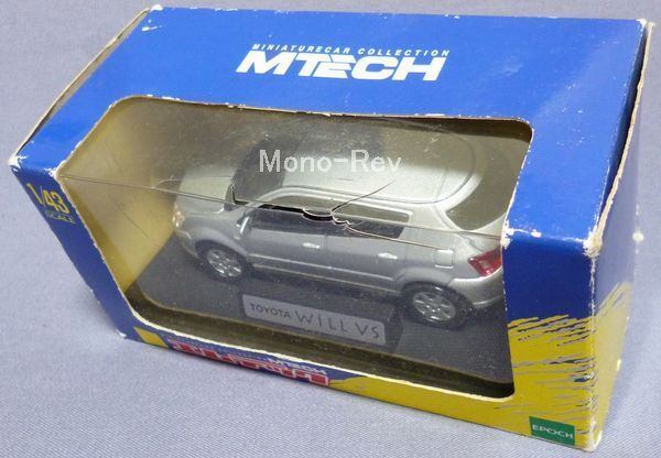 エムテックT-16-B トヨタ WILL VS 2001年発売品、中国製です。スケール1/43(車体長さ約100mm)。裏板に割れあり(接着剤で補修)、開閉アクションはありません。車体カラー:シルバーです。シースルー部に割れあり、擦れ傷みのあるパッケージ付き。
