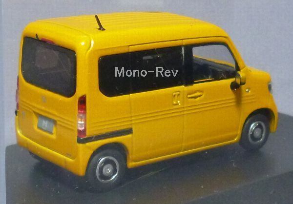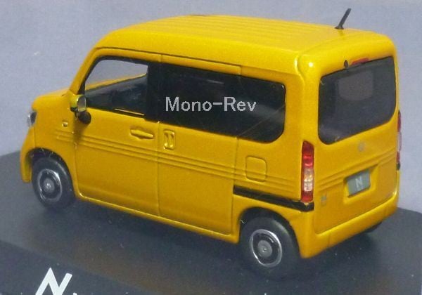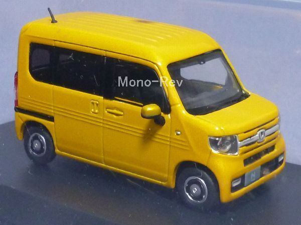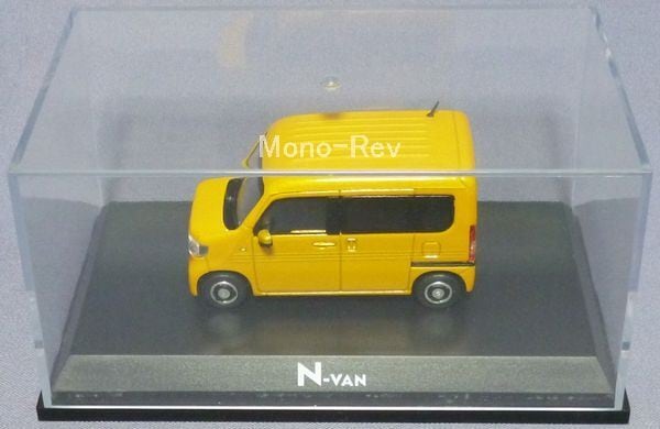 HC(ホンダコムテック)特注1/43 N-VAN +STYLE FUN(JJ1/JJ2) プレミアムイエローパールⅡ、2018年製造品と思われます。スケール1/43(全長約79mm)、クリアケース付(擦れあり)、紙パッケージはありません。中国製。