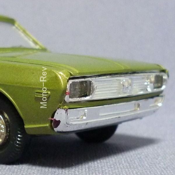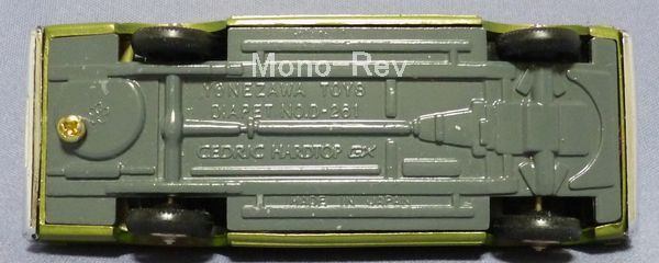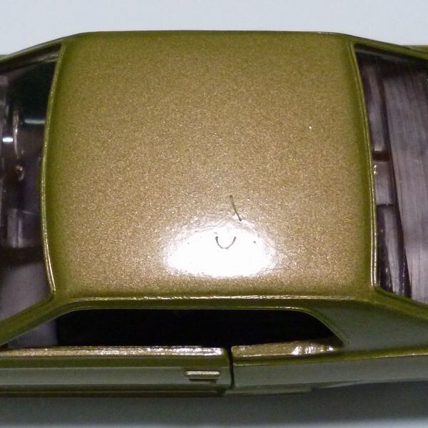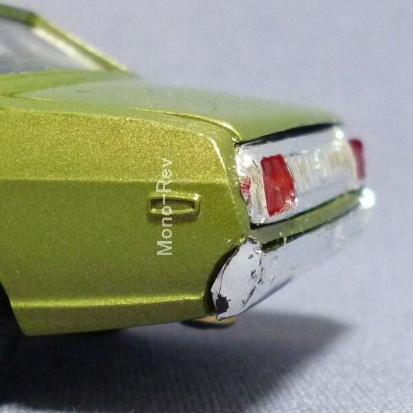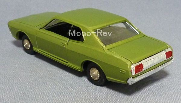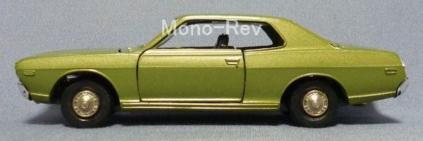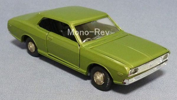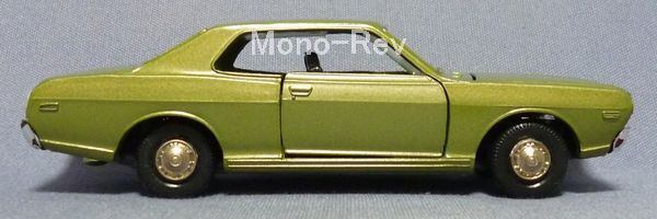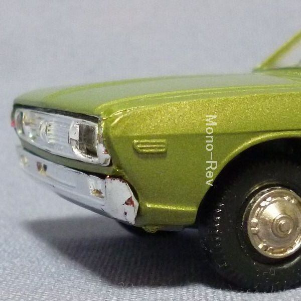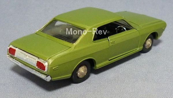 ダイヤペットD-261 日産 セドリック ハードトップ GX (K230GKT)、1971年11月発売品です。ボディカラー:淡緑金メタ、屋根に塗装ゴミ付着あり、バンパーの各角に擦れがあります。スケール1/40(車体長さ約116mm)。その他ドアなどの開閉部にダイヤペットではよく見られる小傷が僅かにあります。箱なし、キレイなクルマです。