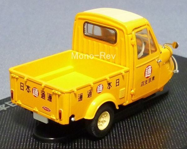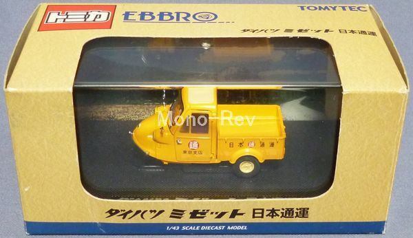 トミカエブロ1/43 ダイハツ ミゼット MP4 日本通運です。ボディカラー:黄(フロント部塗装にプツプツあり)、紙パッケージ、クリアケースつき(表面に擦れあり)、2008年発売品です。