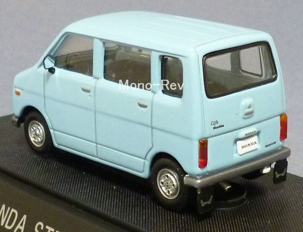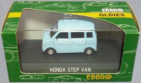 エブロ1/43 ホンダ ライフ ステップバン VAです。製品番号:エブロ43131、ボディカラー:ブルー、紙パッケージ、クリアケースつきです。全長約70㎜。左の前後ドア間のモールド部に一部塗装が乗っていない箇所があります。