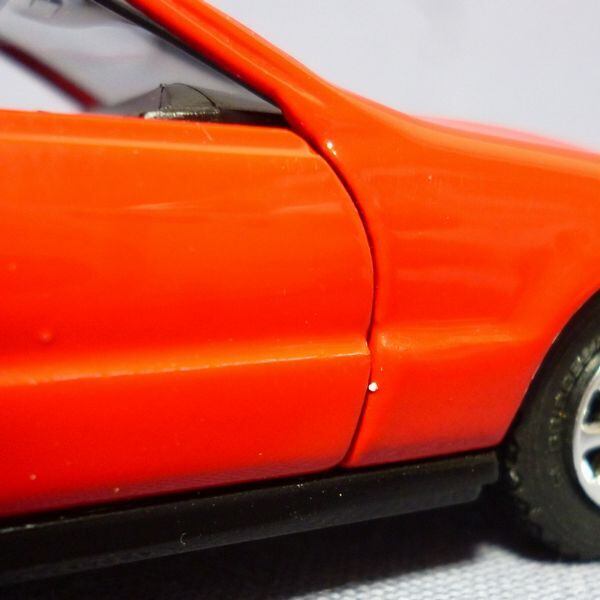 ダイヤペットSV-34 ホンダ プレリュード Si VTEC、1992年頃の製造品。モデルはE-BB4初期型(裏板モールドからすると4WSのBB1かも)で、車体色はレッドです。スケール1/40(車体長さ約110mm)、少し傷みのある箱付です。右フェンダーのドア開閉部にゴミ付着あります(開閉時の傷ではありません)。ほかにダイヤペット固有のゴミ付着や少擦れがあります。
