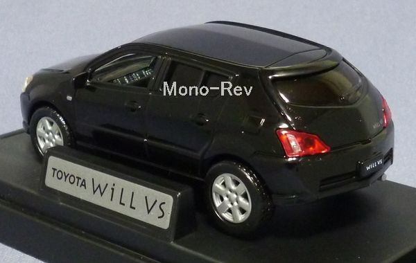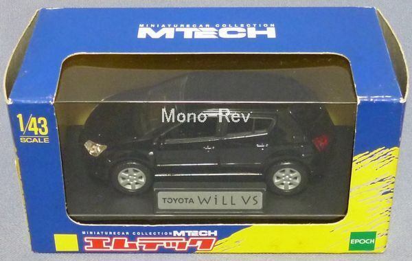 エムテックT-16-C トヨタ WiLL VS 2001年発売品、中国製です。スケール1/43(車体長さ約100mm)。開閉アクションはありません。車体カラー:ブラック、フロントフード左ヘッドライトそばに塗装ゴミ付着あり、左前ピラー屋根近くに小傷、右リヤフェンダーのテールランプそばに点傷が見えます。擦れのあるパッケージ付き。