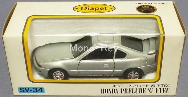 ダイヤペットSV-34 ホンダ プレリュード Si VTEC、1992年の製造品。モデルはE-BB4初期型(裏板モールドからすると4WSのBB1かも)で、車体色はシルバー(セブリングシルバーメタリックをイメージ)です。スケール1/40(車体長さ約110mm)、傷みのある箱付です。ダイヤペット固有のゴミ付着や少擦れがあります。