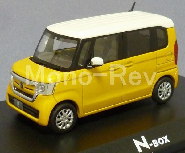 HC(ホンダコムテック)特注1/43 ホンダ N-BOX(JF3/JF4) プレミアムイエローパールⅡ×ホワイト 2017年製造品です。スケール1/43(全長約79mm)、紙パッケージなし、クリアケース付(擦れあり)。初期製造品はドアミラーがボディ下部と同じ色に塗られていましたが、この後期配布品は修正されて白ドアミラーになっています。中国製。2017年8月にモデルチェンジの2代目N-BOXです。