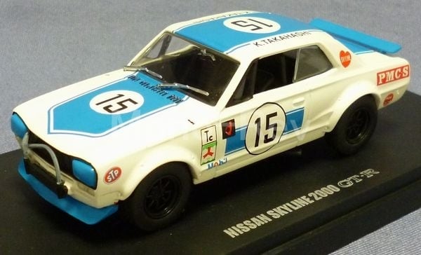 京商ミュージアムコレクションK03022B 日産 スカイライン 2000GT-R (KPGC10)で、1999年以前の比較的初期の製造品と思われます。車体色はアイボリ白にブルーライン カーナンバー15、スケール1/43(車体全長約100mm)です。クリアケース角にヒビあり、パッケージに擦れや傷み、汚れがあります。屋根塗装に凸凹有、側面塗装にも細かなプツプツがあります。1972年3月20日富士GC第一戦富士300kmスピードレース優勝車(GT-R通算50勝目)で、ドライバーはおなじみ、高橋国光です。
