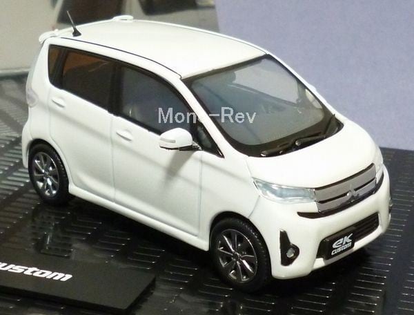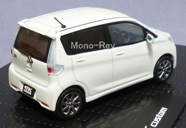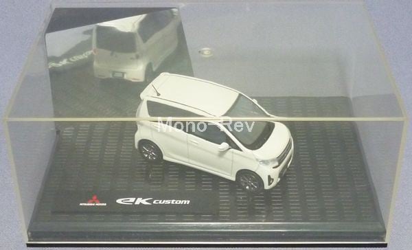 京商1/43 三菱 eK カスタム (B11W) 前期型 、2013年製造品、中国製です。スケール1/43(車体長さ約79mm)、ボディカラー:ホワイトパールです。開閉アクションなし、窓パーツやヘッドライト、テールライトなどのクリアパーツ部品に白濁退色があります。ケースも白っぽく曇りがあります。それ以外はキレイなクルマです。紙パッケージはありません。