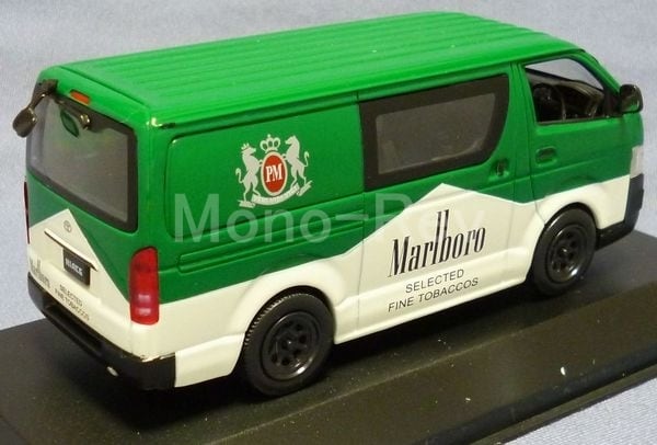 Jコレクション1/43 トヨタ ハイエース バン マールボロ 緑バージョン (200系)、2017年頃の製造品。車体色は緑/白(マールボロ メンソールカラー)にMarlboroロゴです。スケール1/43(車体長さ約110mm)です。紙パッケージ(擦れやシワあり、フタ一部に破れあり)、クリアケースつきです。一般販売されたものなのかどうか不明です。屋根に製造時の小傷が見受けられます(3枚目画像参照)。