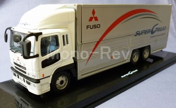三菱ふそうトラックバス特注ダイヤペット 1/43 スーパーグレート FU、中国製です。1~3枚目の画像は以前のもので、今回販売品は荷台にビニール帯の付いた未使用品をお届けいたします。モデルは2003年5月に大幅マイナーチェンジされたKL-FU54JUZ(3V)、撮影用特別仕様車です。全長約275㎜、パッケージ長約345㎜です。パッケージ表面は擦れや傷み、色褪せがあります。プロモーションモデルとして三菱ふそうトラックバスから出た後に、ダイヤペットレギュラー商品でも一部仕様を簡略化して発売されました。この商品はゆうパック80サイズでの発送です(日本全国一律料金:1030円)。