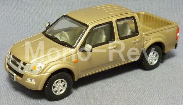 1/43 いすゞ D-MAX 2002~2006年モデル です。車体色:ゴールドメタ、スケール1/43(車体全長約117mm)です。傷んだ紙パッケージつき(内側梱包材破れあり)、いすゞ関係者向け配布品と思われるメーカーモデルです。実車はいすゞ自動車タイランドで生産されているピックアップトラック、初代D-MAXでダブルキャブタイプの4WD車です。