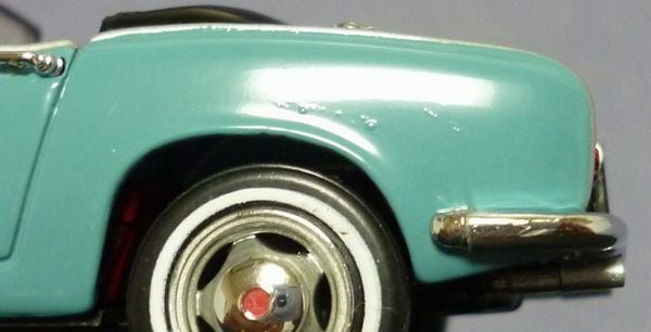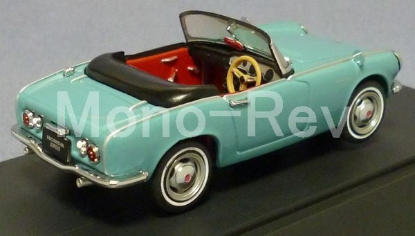 エブロ1/43 ホンダ S600 ブルー、品番43061の初期製品です。ホワイトリボンタイヤ仕様、初期デザイン箱付(シースルー部分の紙も付いたままです)、クリアケース付、デッドストック品です。右後ろフェンダーリップ部は地金処理時にヤスリを当てたのか、やや形が不自然なところがあります。トランク部やフェンダーなどの塗装に細かな凹凸があります。ハードトップ、ソフトトップ部品が付属します。