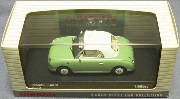 京商1/43 日産 フィガロ (E-FK10)、2007年入荷品です。車体色:エメラルド、スケール1/43(車体全長約85mm)です。ボディ側面の塗装に細かなプツプツがあります。また、ボディのどこかしらに接着剤附着があります。日産パッケージです(少擦れあり)。