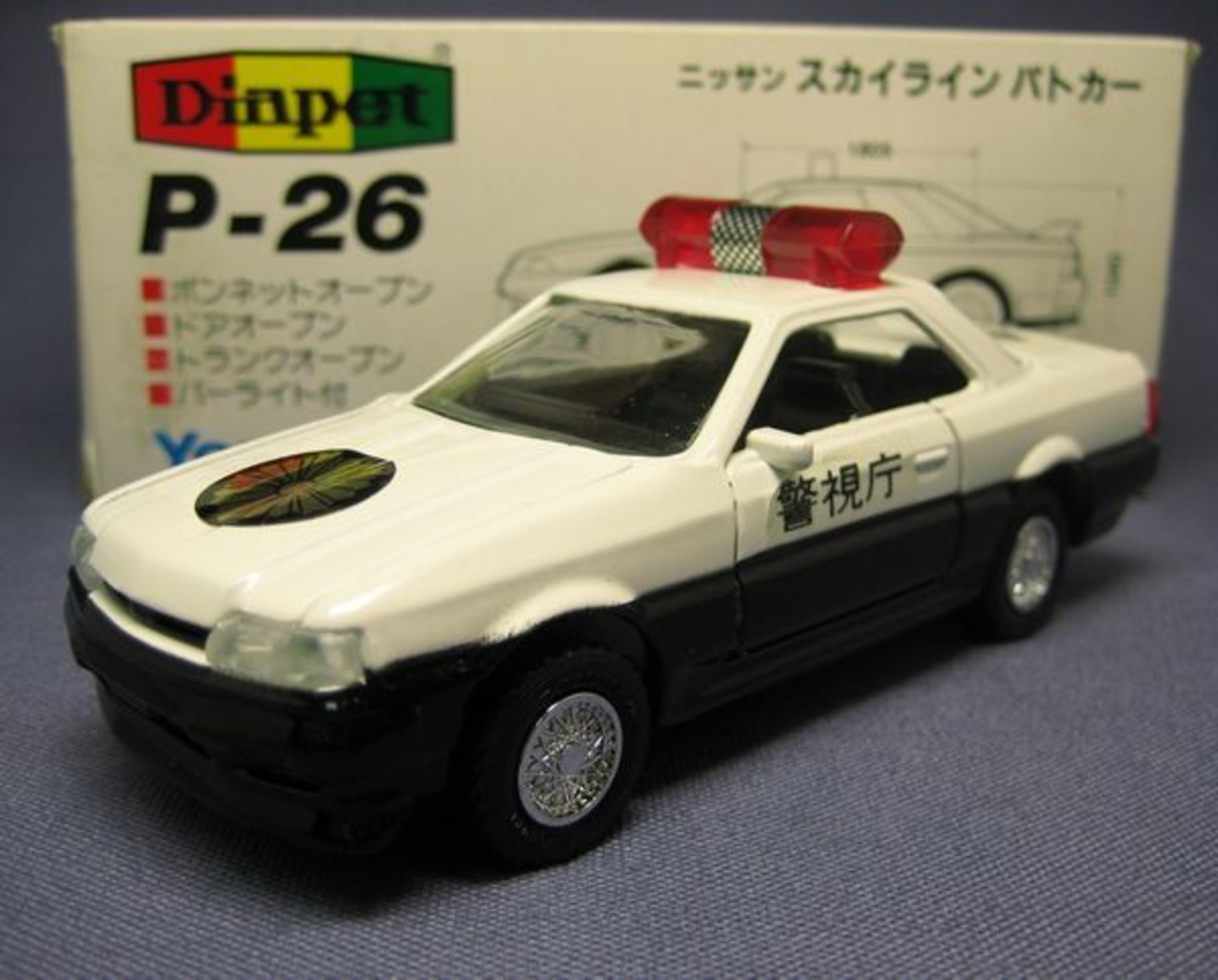 ダイヤペットP-26 日産 スカイライン パトカー(HR31)、1991年製造品の日本製で箱付(やや傷みあり)です。シールにめくれあり(ドアミラーに干渉しているため完全に貼られていない状態)、ドア開閉部に小傷あります。白黒ツートーンの白部分はアイボリーホワイト風です。タイヤは刻印のある合成ゴムタイプ。G品番~SV品番のR31金型そのままを流用しているのでトランク部の開閉機構が残っています。