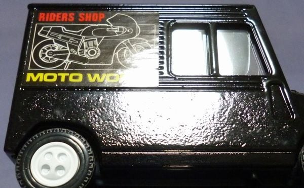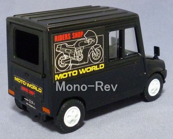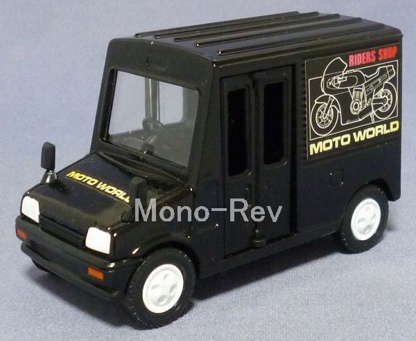 ダイヤペットSV-01 ダイハツ ミラ ウォークスルーバン L70V、1989年の製品です。車体色:黒です。スケール1/32(車体長さ約102mm)。黒ボディ塗装面に細かな凸凹があります。左側面のシールに色褪せがあります。傷みのあるパッケージ付。