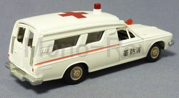 ダイヤペット203 トヨペット クラウン 救急車 1971年発売品です。ダイヤペットで比較的長期間作られましたが、途中コストダウンなどの関係で数バリエーションあります。今回ご紹介のクルマはバンパーやグリル、タイヤホイールなどがしっかりできている初期モデルです。車体色:白(左フェンダーリップ部に小傷、左後輪後ろの塗装に黄ばんだ部分があります)、当時の同梱カタログ付き、箱付きです。バックドア左の上部に汚れ付着あり、他ダイヤペット固有の細かな擦れや小傷があります。製造後50年以上経過していますが比較的キレイなクルマです。スケール1/40(車体長さ約139mm)。