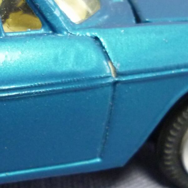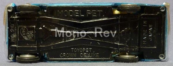 モデルペット20L トヨペット クラウン デラックス RS41、アサヒ玩具1965年7月発売の日本製です。ボディカラー:青メタ、表示スケール:1/42、シートカラー:アイボリ白です。ハンドル取り付けに曲がりあり、フロントフードプレスライン部や開閉部(前窓側)に小傷や擦れあり、ボディ側面や屋根などの塗装にプツプツなど荒れがございます。後ろ窓とトランクのモールド部にかけて塗料たれがあります(おそらくメーカーがタッチアップしたものと推測)。ダイヤカットガラスもすべて付いています。他細かな擦れ等も若干ありますがパッと見た感じは大変キレイな印象です。箱なしです。1963年9月のマイナーチェンジ車をモデル化しています。モノレブYouTubeチャンネル動画第82回に登場のクルマです。