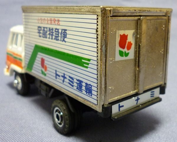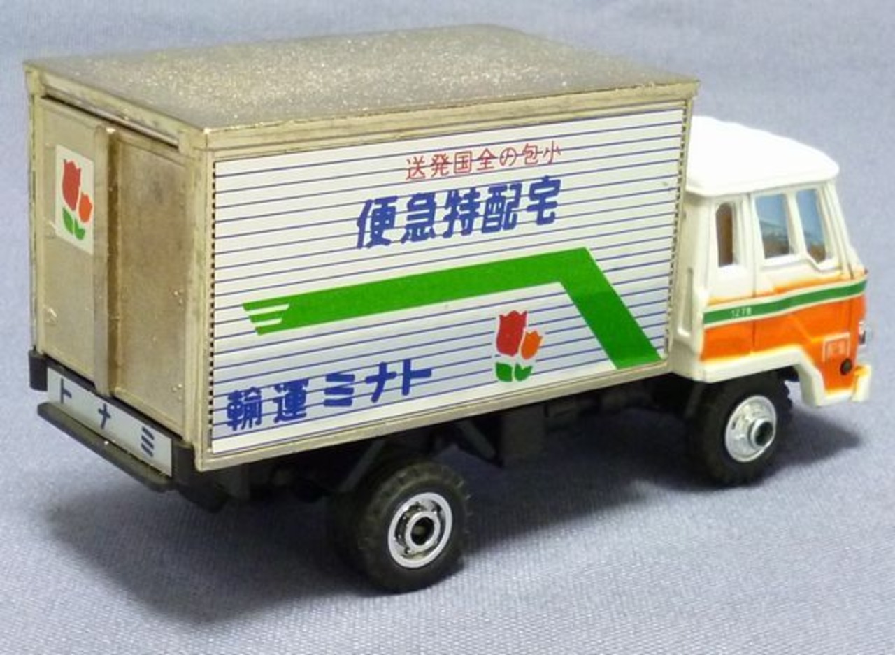 シンセイ 宅配便シリーズ T-17 トナミ運輸 旧カラー 日本製です。クルマは三菱ふそうFKのキャブのドア金型を初代ファイター風に変更し、グリルを角型ヘッドランプのものを新造しています。表示スケール:1/60(全長約100㎜)、キャブカラー:アイボリ白/オレンジ、荷台メッキ部(特に後部扉端部)に傷あります。パッケージは汚れや変形、ふたに破れがあります。1985年ごろの製品。