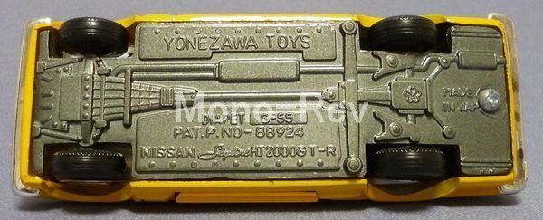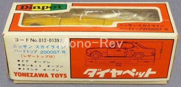 ダイヤペットG-55(01393) 日産 スカイライン 2000 GT-R(KPGC10)、1976年9月発売品です。ボディカラー:黄に黒レザートップ風の部分はシボ塗装です。スケール1/40(車体長さ約113mm)、少し潰れの有る箱付きです。バンパーに擦れが僅かにありますがキレイなクルマです。