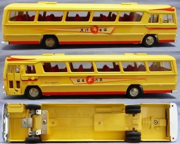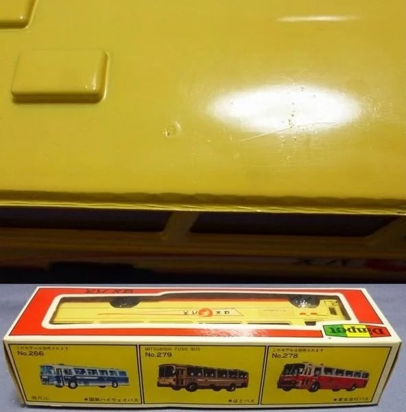 ダイヤペットD-279 はとバス、1972年発売の日本製です。ボディカラー:クリーム黄、スケール:1/50(箱表示は1/40となっていますが実車日に換算すると1/50が妥当、長さ約230mm)、シートカラー:赤(起毛タイプ)、フロントステア機構、ドア、エンヂンルーム(パッケージ表記のまま)です。ダイキャストムラでピン穴が屋根と窓の境目にあります。また屋根塗装に出荷前のタッチアップ処理がございます。左前タイヤすぐ後ろのシールは色褪せで「はとバス 都内一周コース」文字が消えています。他キズなく大変キレイなはとバスです。シールはさすがに製造後45年ほど経過していることもあり、糊が弱くなっております(一部剥がれや折れ曲がりがございます)。遊び方説明書、当時のダイヤペットカタログも付属します。箱状態はシワがあるもののキレイな状態です。
