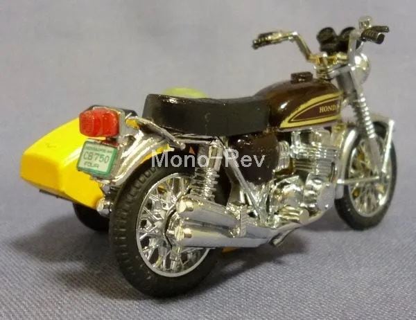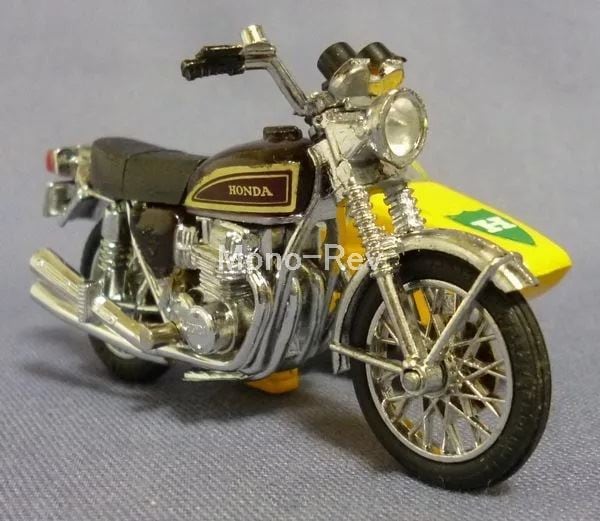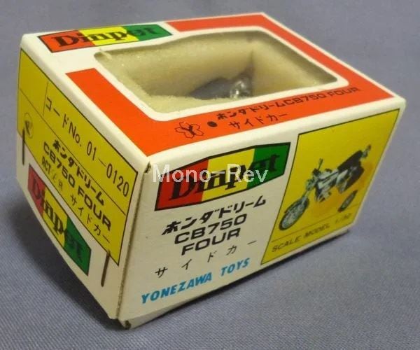ダイヤペット0120 ホンダドリームCB750 FOUR サイドカー1973年発売の日本製で箱付です。スケールは1/30(全長約73mm)です。箱に記載の品番は01-0120です。バイク車体色はこげ茶、サイドカーは黄色でとてもキレイです。箱は若干の変形や書き込みがあるものの、良い状態です。