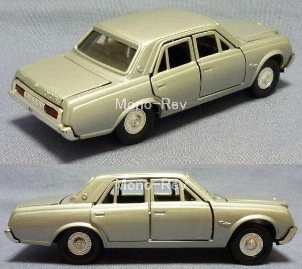 ダイヤペットG-25 トヨタ センチュリー VG21 シルバー、1977年発売品です。車体色:シルバー、スケール1/41くらい(車体長さ約120mm)、パッケージつき(シースルー部に値札はがし痕あり)。当時の子の大きさに対して、開閉フルアクションですが、後部ドアの閉まりは画像の通りピッチリとはいきません。ボンネットやトランク部、後窓枠部上側などに塗装のプツプツがあります。左前ホイールのみメッキの雰囲気が違います。バンパーにも若干擦れがございます。
